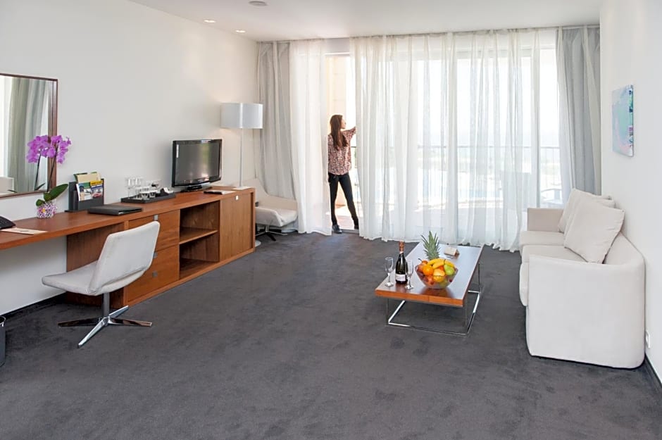 Featuring a private entrance, this air-conditioned suite consists of 1 living room, 1 separate bedroom and 1 bathroom with a walk-in shower and a bath. The spacious suite provides a flat-screen TV with cable channels, soundproof walls, a mini-bar, a tea and coffee maker as well as sea views. The unit offers 1 bed.